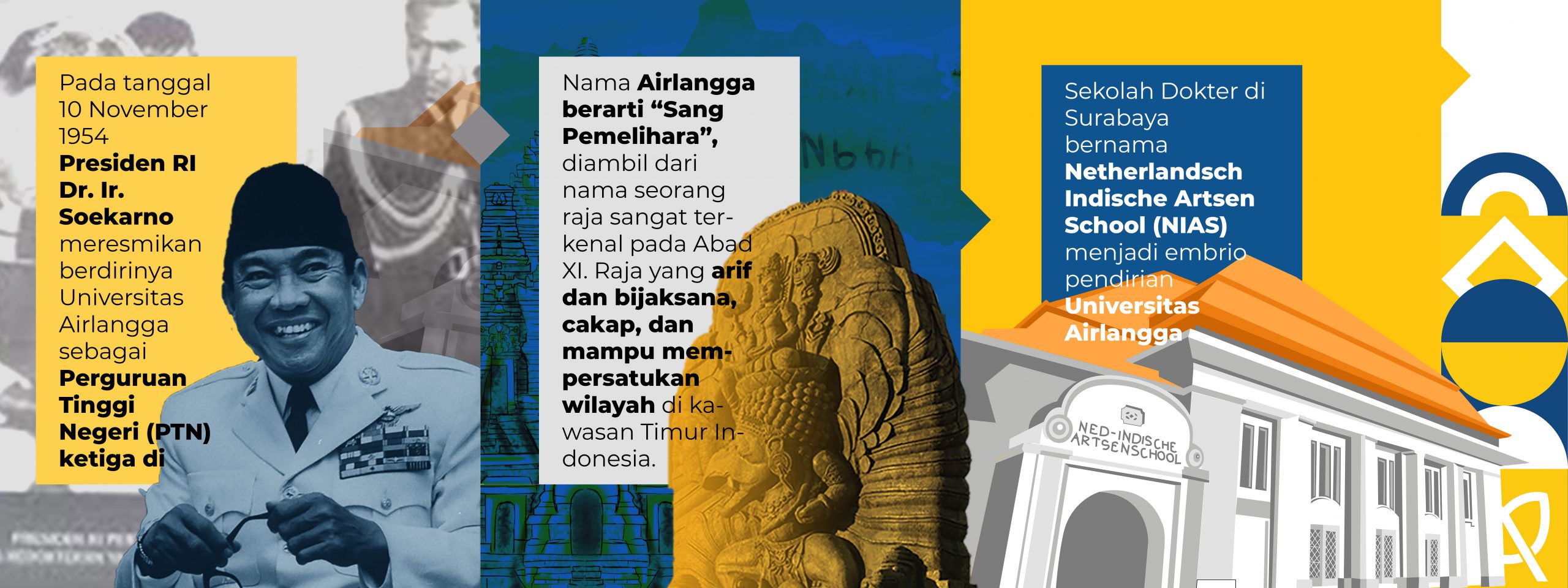 Universitas Airlangga madué sejarah sané sué. Sadurung Unair resmi kadiriang, ring tanggal 9 miwah 11 Oktober 1847, kaunggahang usul majeng Pamréntah Kolonial Belanda antuk mendidik para yowana Jawa sané bakat dados ahli-ahli praktik kesehatan. Ring 2 Januari 1849, majalaran antuk Keputusan Pamréntah No.22, NIAS (Nederlandsch Indische Artsen School) kaadegang pinaka genah pendidikan dokter ring Surabaya.[3] Ngawit warsa 1913, pendidikan dokter ring Surabaya kamargiang ring Jalan Kedungdoro 38 Surabaya. Ring warsa 1923, wangunan NIAS kagingsirang saking Jalan Kedungdoro ka genah Fakultas Kedokteran Unair ring Jalan Mayjen. Prof. sane Dr. sane Moestopo, Surabaya.